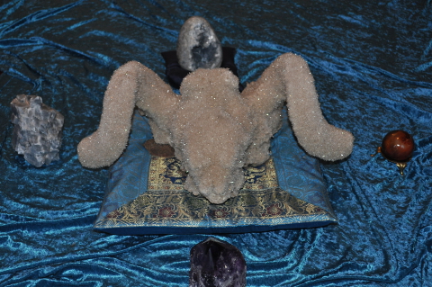 In der Meditation, die ich bei Wolfgang Hahl in seinem Seminar: „Neue Botschaften der Weißen Büffelfrau zur Zeitenwende“ im April 2013 mit meinem Kristallschädel vor ca. 40 Teilnehmern halten durfte, tauchte wie aus dem Nichts auf der blau samten Meditationsunterlage des Schädels eine kleine weiße Spinne auf. Sie leuchtete wie ein Stern und es war für uns alle sehr aufregend dies zu sehen – ein Gruß von der heiligen weißen Spinnenfrau, die mit meinem Kristallschädel ebenso verbunden ist wie die weiße Büffelfrau. Genauso schnell wie sie anfangs aufgetaucht war, verschwand sie dann während der Meditation auch wieder.